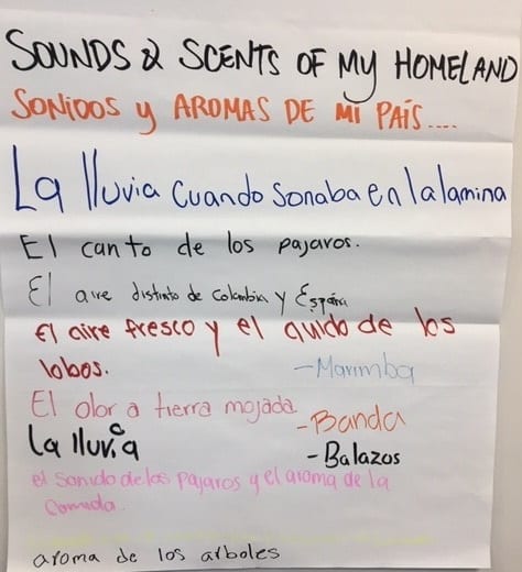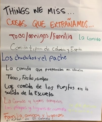 Restorative justice, an approach to healing harm through the rebuilding of relationships, can help educators in supporting students and elevating student voice. At the Partnership, we build capacity among educators to implement restorative justice practices both as a conflict resolution strategy and as an overarching vision and tool for relationship building across the school community. Recently at Mendez High School in Boyle Heights, we gathered in circle with a group of English Language Learners to share stories about our migration journeys. Mr. Contreras, English teacher and Restorative Communities Lead, and I shared our own stories, then asked students to chart what they missed about their homeland, things they do not miss, and who or what they are grateful for. Students’ young, joyful faces turned expressive as they wrote such statements as, “I don’t miss the dead bodies that appeared in the streets or in the fields,” and “I don’t miss bad influences, the crime, and the corruption.” Yet, there was beauty amidst the heartache. Many shared beautiful scenes of their homelands that stand in sharp contrast with the violent images we see in the media. They miss specific sounds and scents from their homeland. Some said, ”I miss the food,” “Playing soccer or fútbol in the fields,” and “my friends and family” (see image 1). Others stated missing the rain, the birds, the fresh air, the trees, the smell of wet earth and the banda music (see image 2). Storytelling activities such as this are a powerful way to engage youth and validate students’ lived experiences.