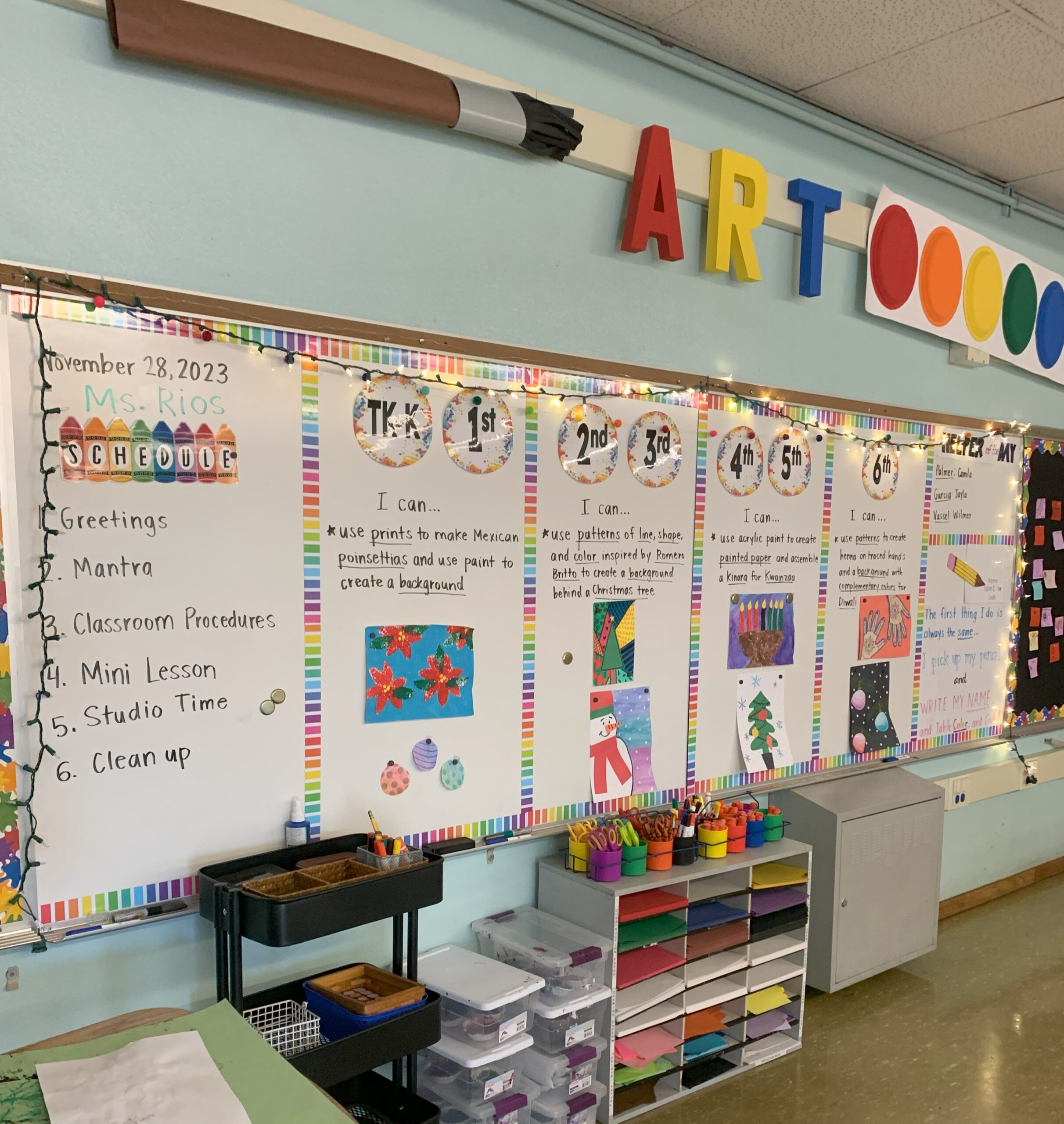 Diana shared that one of her 5th-grade students, who is always engaged but quieter than most, wrote about their future and said they wanted to be an art teacher when they grew up. “It is an honor to be trusted with this role,” Diana noted. She teaches about four or five- classes daily, 23 blocks of time throughout the year, serving about 500 students in TK-6 grades. The feedback she has received from her peers is overwhelmingly positive. She said her peers feel having a consistent, full-time arts teacher is better because students get to build trust and get access to comprehensive arts education. She doesn’t take her responsibility lightly.